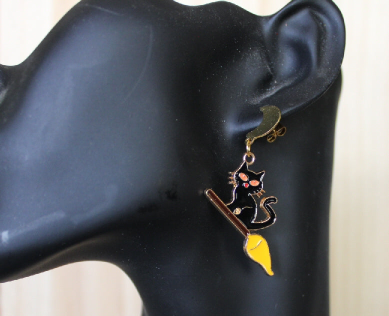 Add some whimsical charm to your look with these Flying Black Cat Posts. Featuring a playful black cat soaring on a broomstick beneath a glowing quarter moon, these earrings bring a hint of magic and mischief to any outfit. Lightweight and easy to wear, they’re perfect for cat lovers and Halloween enthusiasts alike. Let your style take flight!